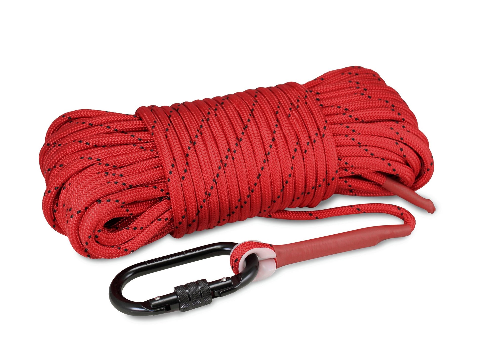 This heavy duty rope is ideal for magnet fishing with our larger magnets. Eight inner strands make it exceptionally strong for its weight and size. Save time and frustration trying to tie the perfect knot - comes with the end sewn, looped with plastic thimble, and heat shrink tubing to keep it from coming undone. High quality carabiner, rated to 5600 lbs is included with the rope.