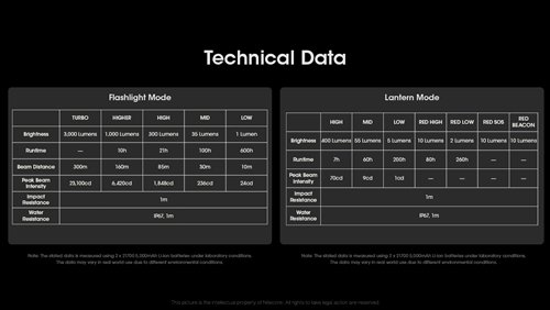 The Nitecore LR70 is a versatile 3-in-1 camping lantern, flashlight, and power bank. When used as a flashlight, it is capable of producing up to 3000 lumens and providing a throw distance of up to 328 yards, making it ideal for camping and outdoor activities. When you use the LR70 as a lantern, it can emit up to 400 lumens, providing 360-degree illumination whether it's placed on a surface or hung. It also offers multiple red light options, including High and Low brightness settings to preserve your night vision, as well as Beacon and SOS modes for emergency situations. If you're on the move, you can turn the LR70 on its side and utilize its Flashlight mode, which offers a choice of 5 different brightness settings.