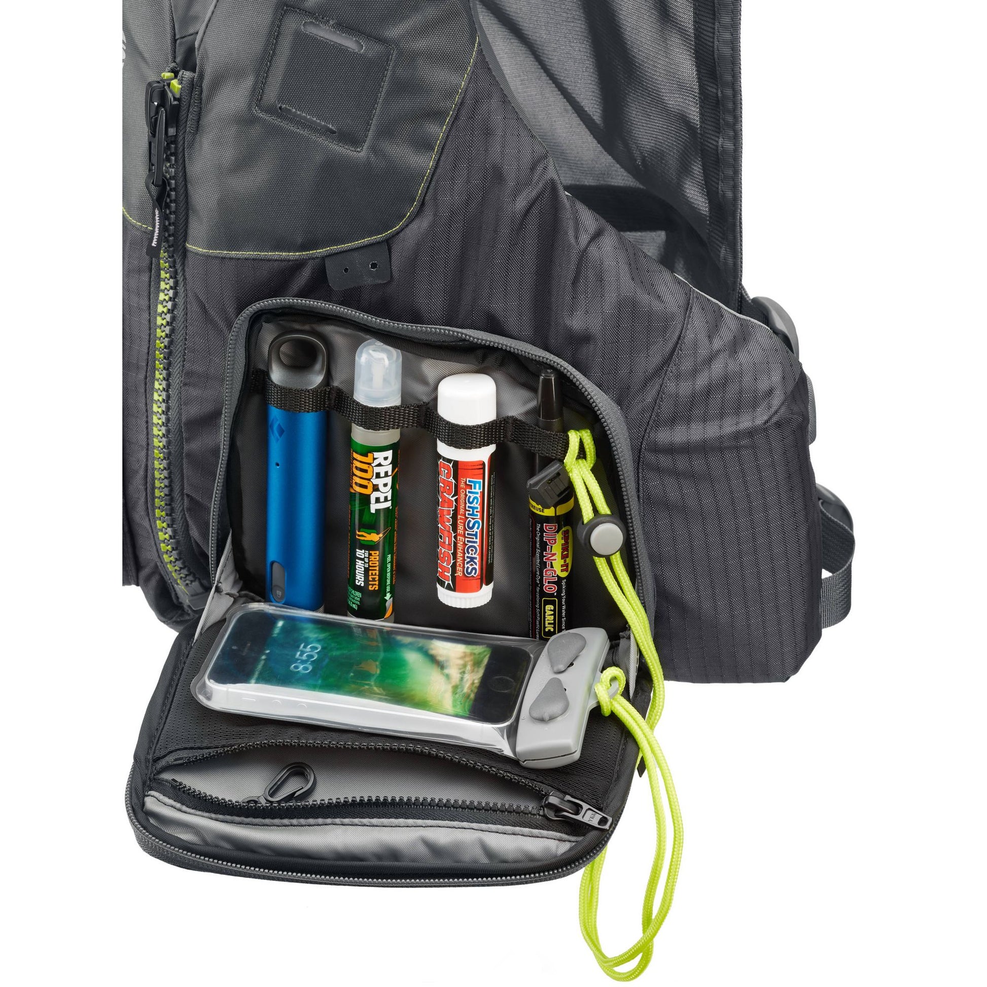 - A fifth, tool holder pocket offers quick access to pliers, line cutters or other fishing gadgets and accessories.